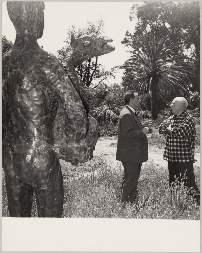 Pablo Picasso et Henri-Georges Clouzot avec au premier plan la sculpture en bronze "L'Homme au mouton" de dos dans le jardin de la Californie, Cannes, en 1960-61