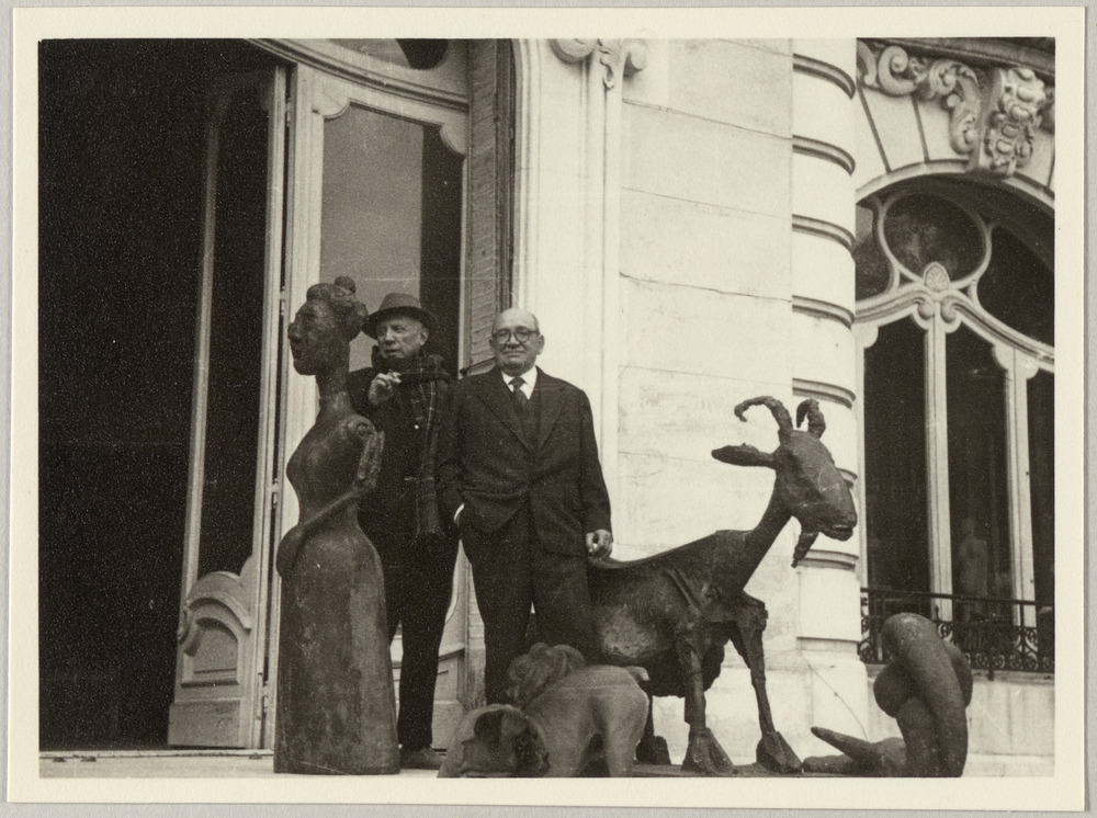 Pablo Picasso et Jacint Reventós Bordoy avec les sculptures "La femme en robe longue" et "La Chèvre" sur le perron de La Californie, Cannes, en février 1956