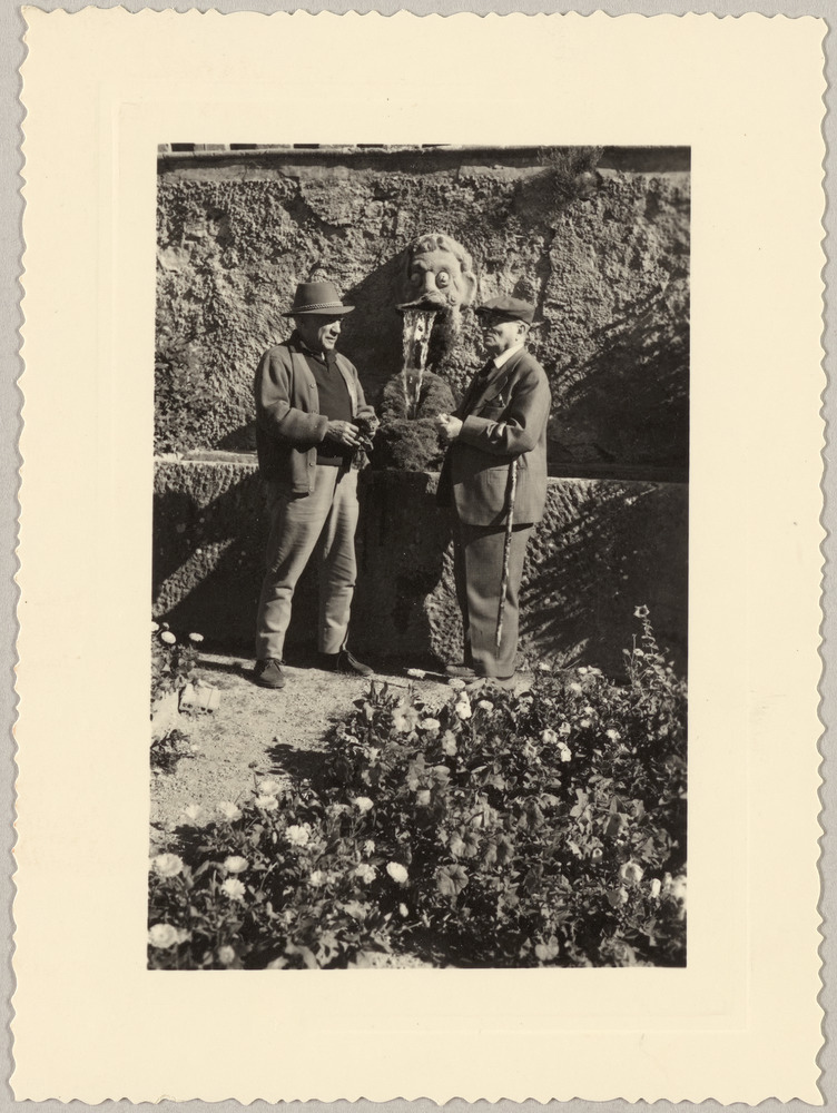 Pablo Picasso et Jaime Sabartés à la fontaine, Château de Vauvenargues, vers 1958-59