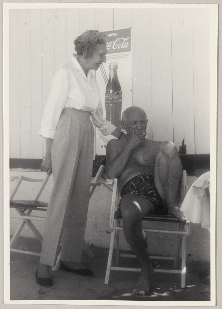Pablo Picasso et Jeanne de Rochette, femme de Manolo Hugué, dans un restaurant de la Garoupe, à Antibes, en 1955