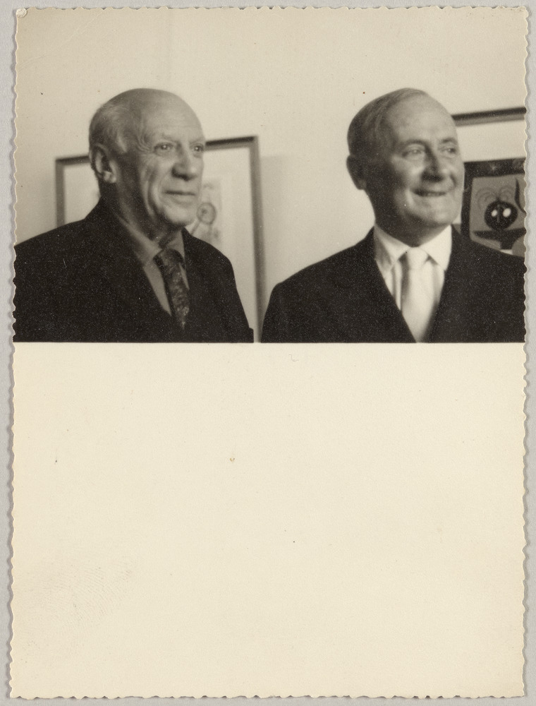 Pablo Picasso et Joan Miró à l'exposition Miró [dans la Galerie Henri Matarasso, Nice, en 1957]