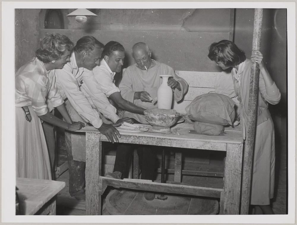 Pablo Picasso et Jules Agard montrant une technique de polissage à Gary, Veronica et Maria Cooper à l'atelier Madoura, Vallauris, en [juin-juillet] 1956