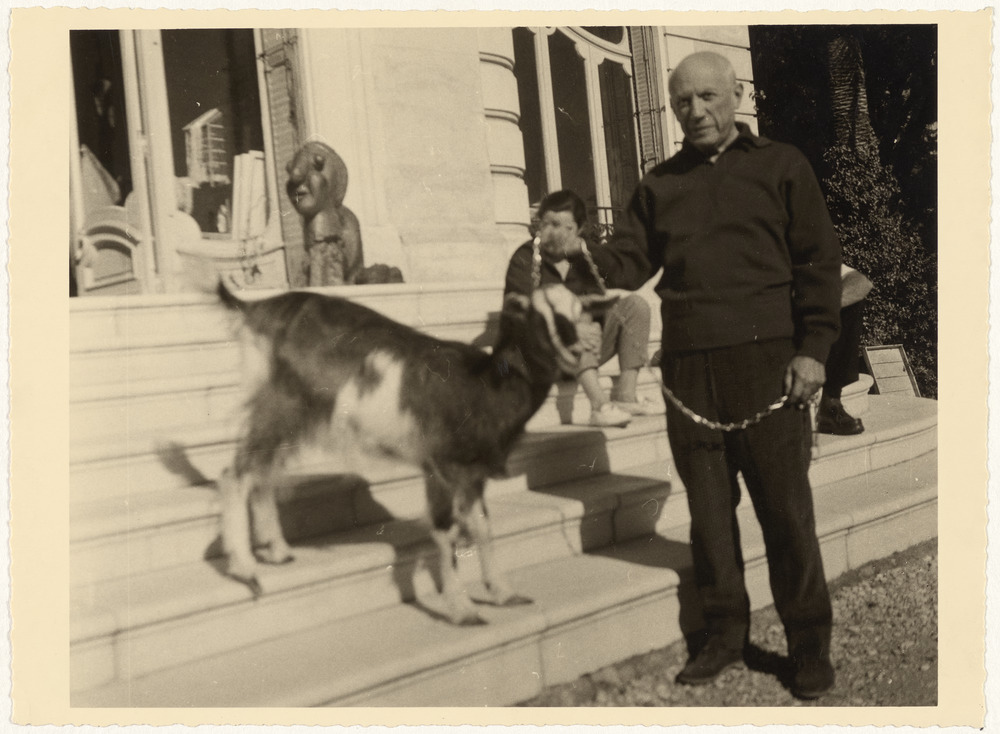 Pablo Picasso et la chèvre Esmeralda sur les marches du perron de La Californie…