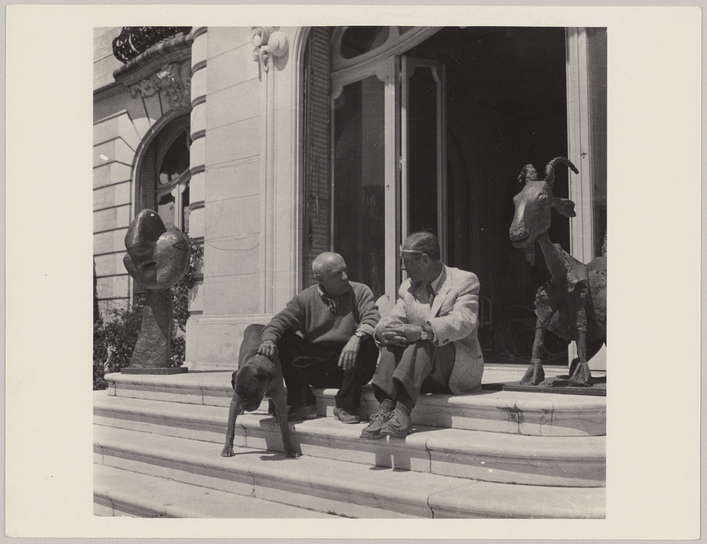 Pablo Picasso et le cinéaste Sergei Yutkevich avec Yan le boxer à côté des sculptures "La Chèvre" et "Tête de femme" sur le perron de La Californie, Cannes, en 1959