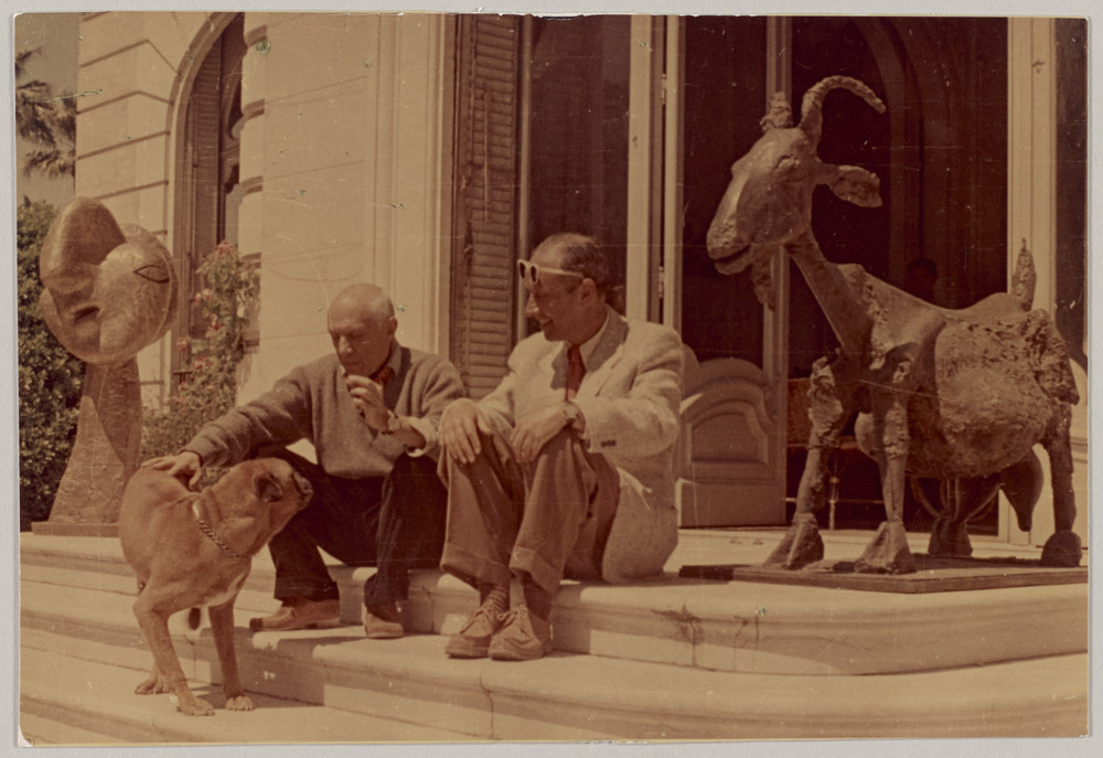 Pablo Picasso et le cinéaste Sergei Yutkevich avec Yan le boxer entre "La Chèvre" et "Tête de femme" sur le perron de La Californie, Cannes, en 1959