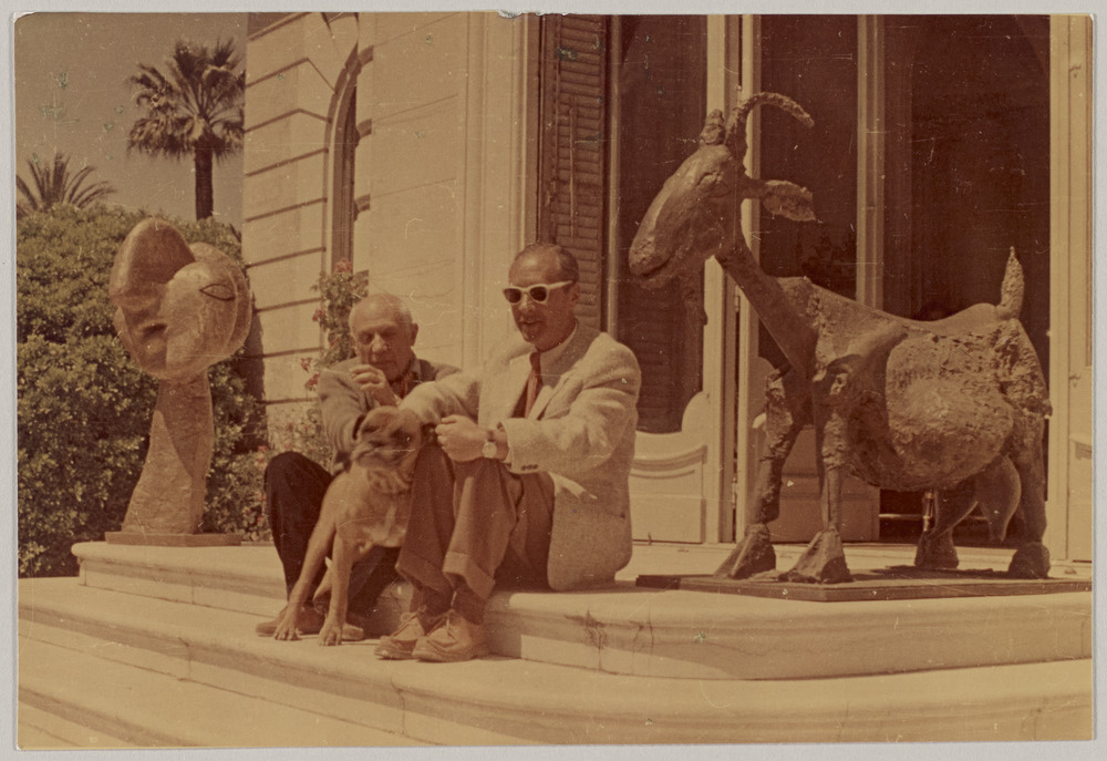 Pablo Picasso et le cinéaste Sergei Yutkevich avec Yan le boxer entre "La Chèvre" et "Tête de femme" sur le perron de La Californie, Cannes, en 1959