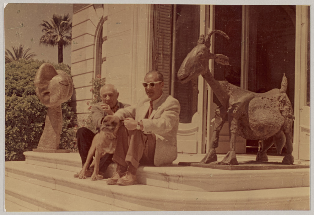 Pablo Picasso et le cinéaste Sergei Yutkevich avec Yan le boxer entre "La Chèvre" et "Tête de femme" sur le perron de La Californie, Cannes, en 1959
