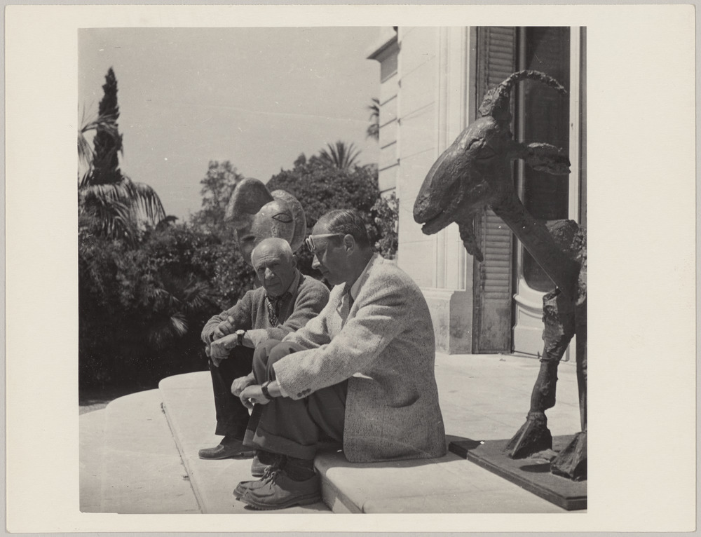 Pablo Picasso et le cinéaste Sergei Yutkevich à côté des sculptures "La Chèvre" et "Tête de femme" sur le perron de La Californie, Cannes, en 1959