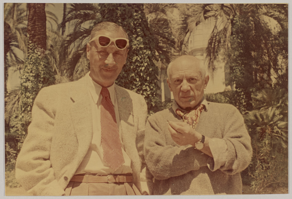 Pablo Picasso et le cinéaste Sergei Yutkevich dans le jardin de La Californie, Cannes, en 1959