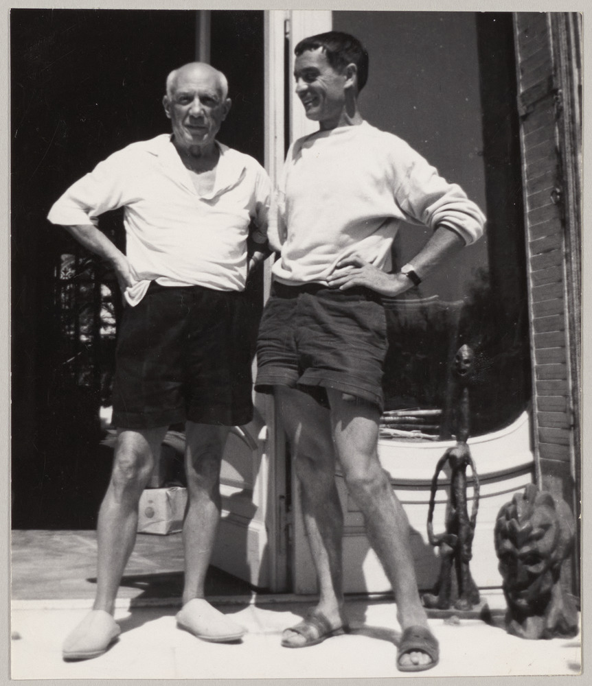 Pablo Picasso et le peintre suisse René Bernasconi sur le perron de La Californie, Cannes, en 1955