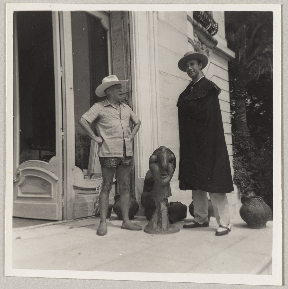 Pablo Picasso et Luis Miguel Dominguín à côté de sculptures dont "Tête de femme" sur le perron de La Californie, Cannes, en 1957