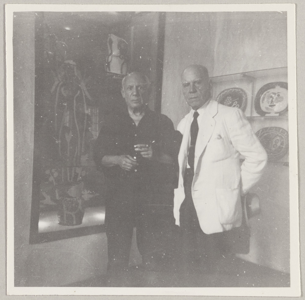 Pablo Picasso et Manuel Pallarès devant des vitrines de céramiques du Château Grimaldi, Antibes, circa 1956