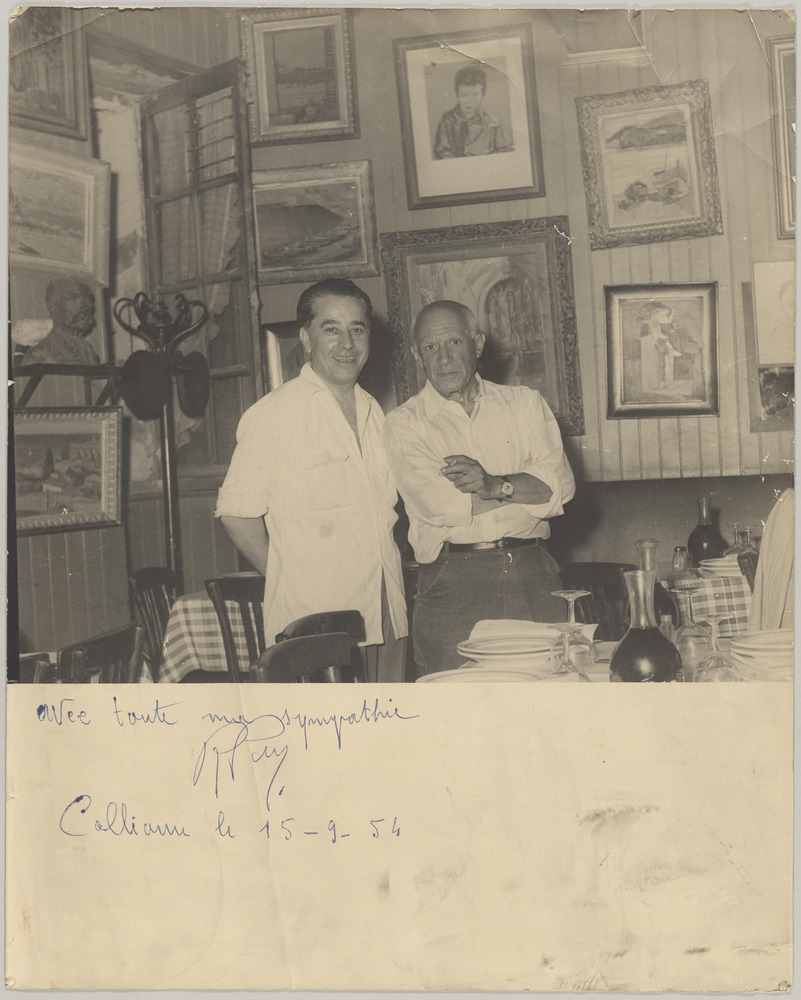 Pablo Picasso et [R. Puy] dans un café-restaurant de Collioure, en 1954