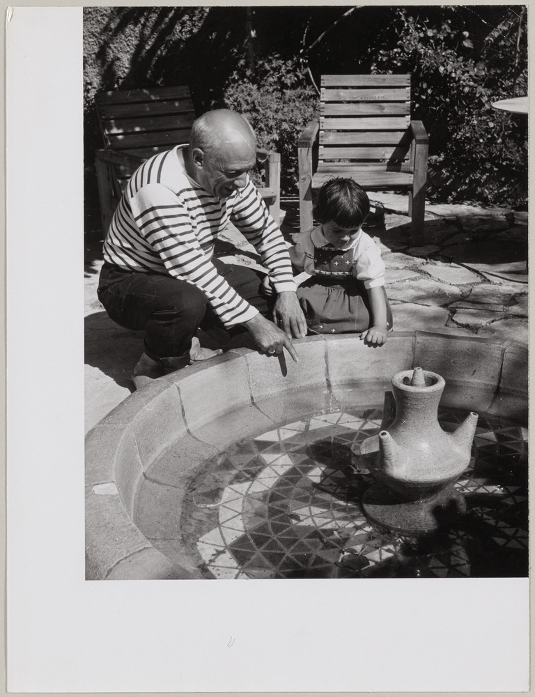 Pablo Picasso et sa fille Paloma devant la fontaine dans la cour de La Galloise, Vallauris, en 1952