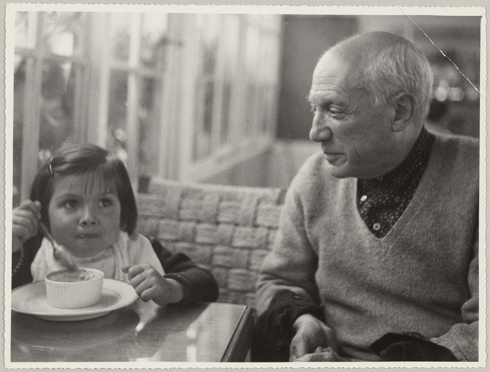 Pablo Picasso et sa fille Paloma devant une crème au caramel, [à La Galloise, Vallauris, en 1952-53]