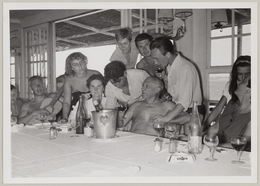 Pablo Picasso et ses enfants Maya et Paul, Francisco Reina dit 'Minuni', des amis et, à leur gauche, Dominique Eluard et sa fille Caroline Lemort au restaurant Nounou, plage de Golfe-Juan, été 1954