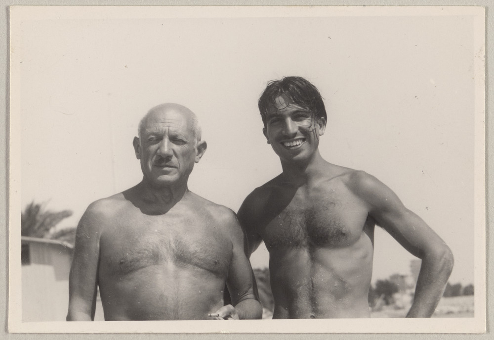 Pablo Picasso et son neveu Javier Vilató Ruiz sur la plage de Golfe-Juan, en 1948
