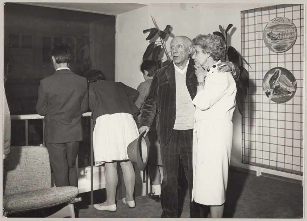 Pablo Picasso et Suzanne Ramié lors de l'inauguration de la galerie Madoura, Cannes, début 1961
