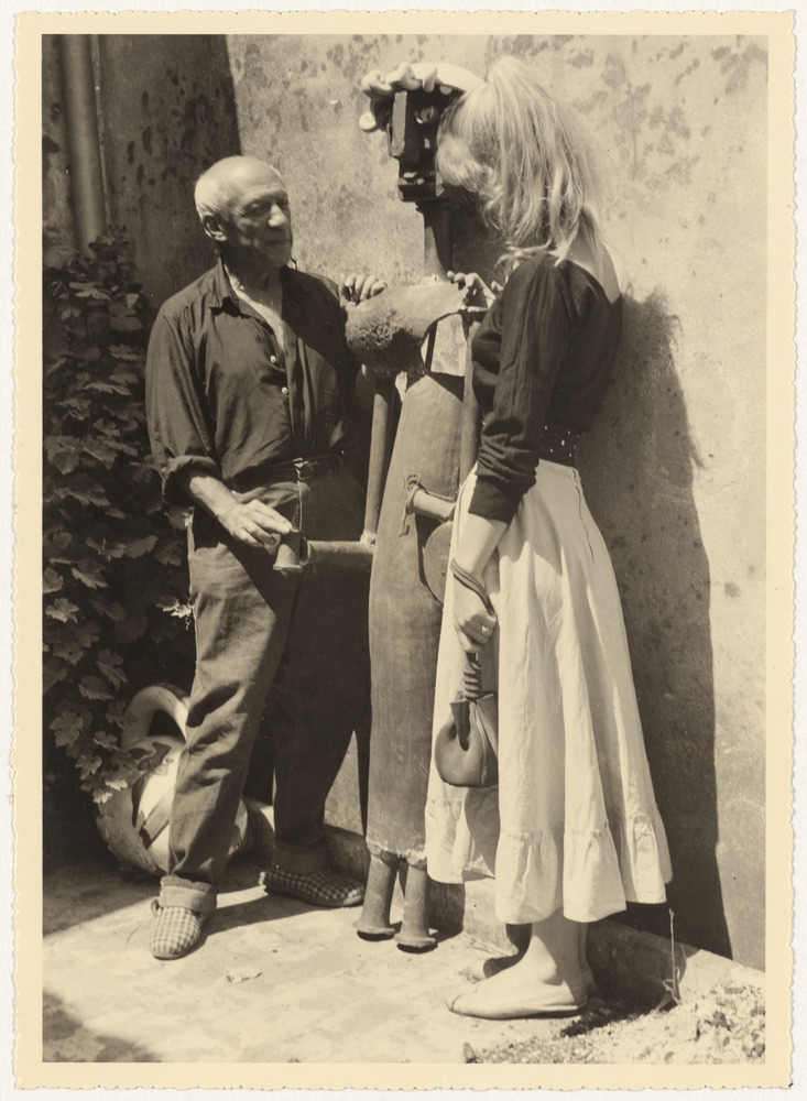Pablo Picasso et Sylvette David devant la sculpture en bronze et pierre "La femme à la clé" ou dit "La taulière", sur la terrasse de La Galloise, Vallauris, en 1954