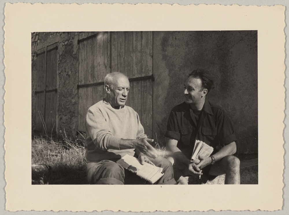 Pablo Picasso et un homme dans la cour de l'atelier du Fournas, Vallauris, circa 1954