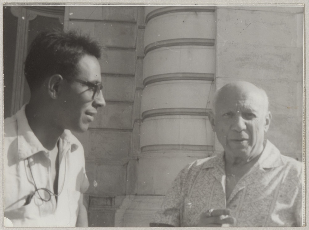 Pablo Picasso et un journaliste dans le jardin de La Californie, Cannes, en août 1958