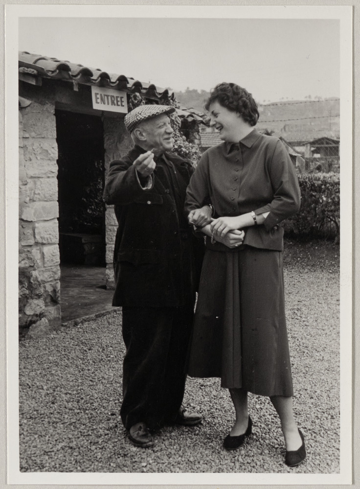 Pablo Picasso et une femme devant l'atelier Madoura, Vallauris
