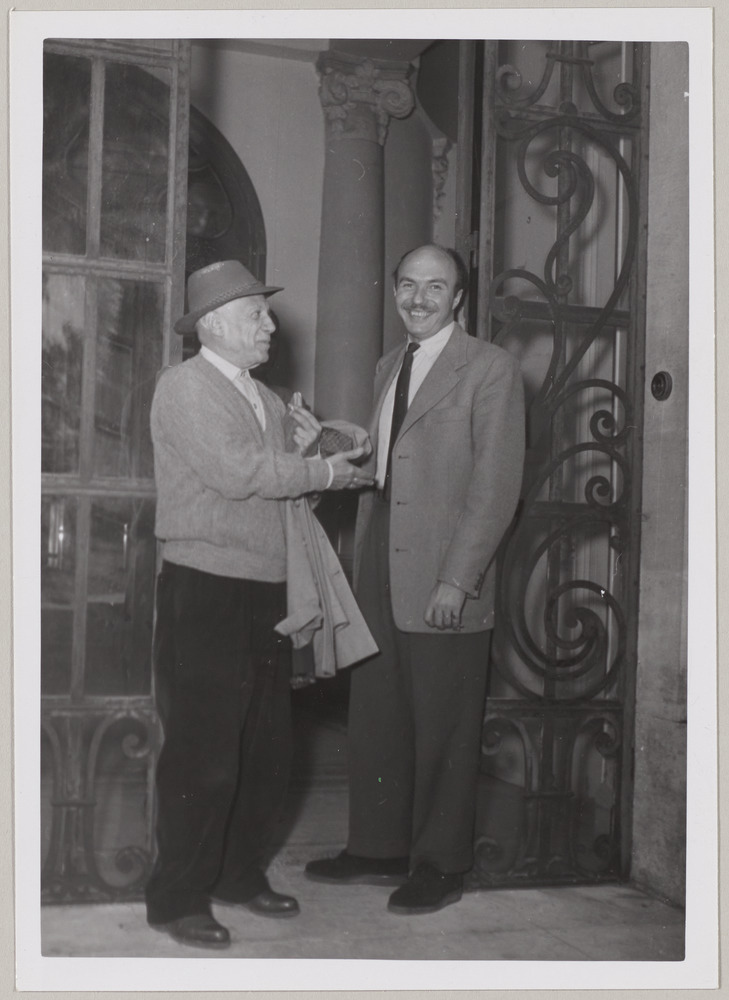 Pablo Picasso et Yves-Marie Pelloux, agent immobilier, à l'entrée de La Californie, Cannes, circa 1954-55
