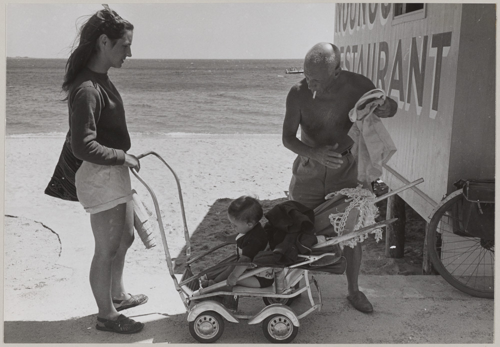 Pablo Picasso, Françoise Gilot et leur fils Claude à la plage de Golfe-Juan, en été 1948