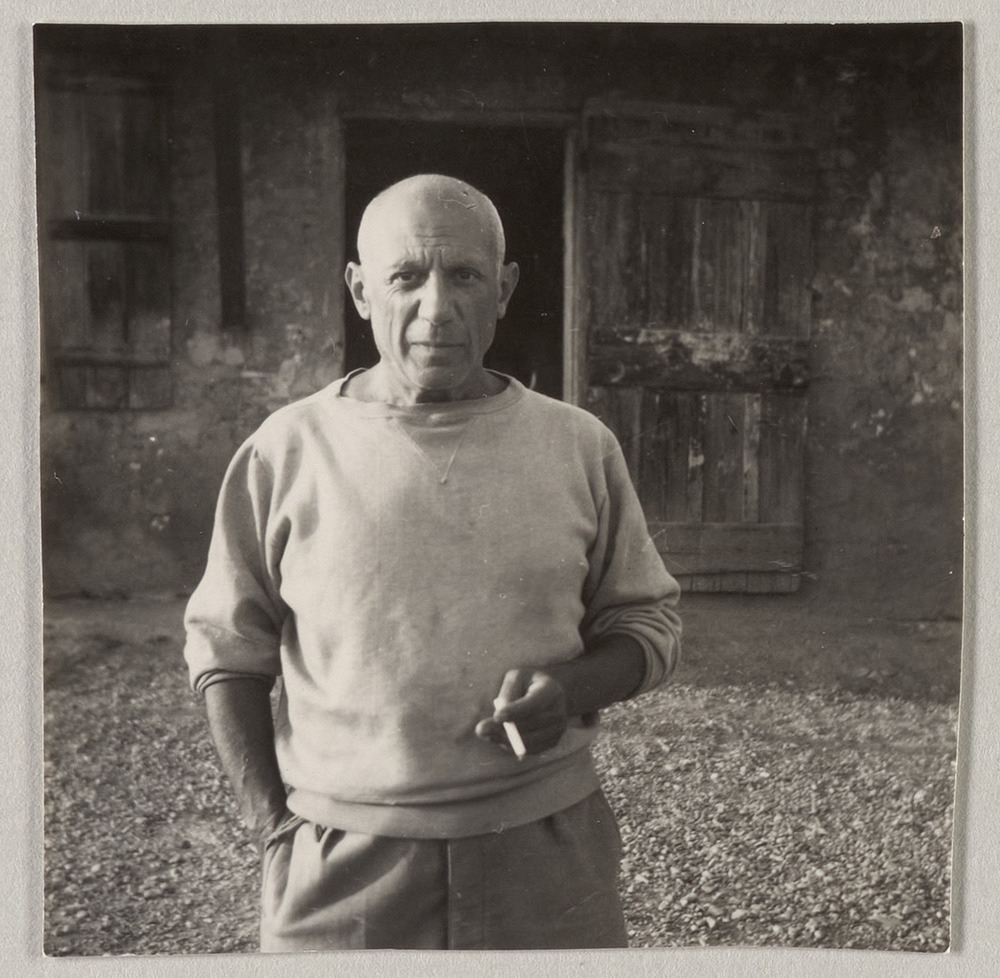Pablo Picasso fumant une cigarette dans la cour de l'atelier du Fournas, Vallauris