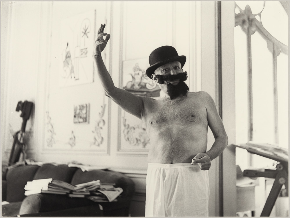 Pablo Picasso imitant Henri-Désiré Landru avec une barbe postiche et un chapeau…