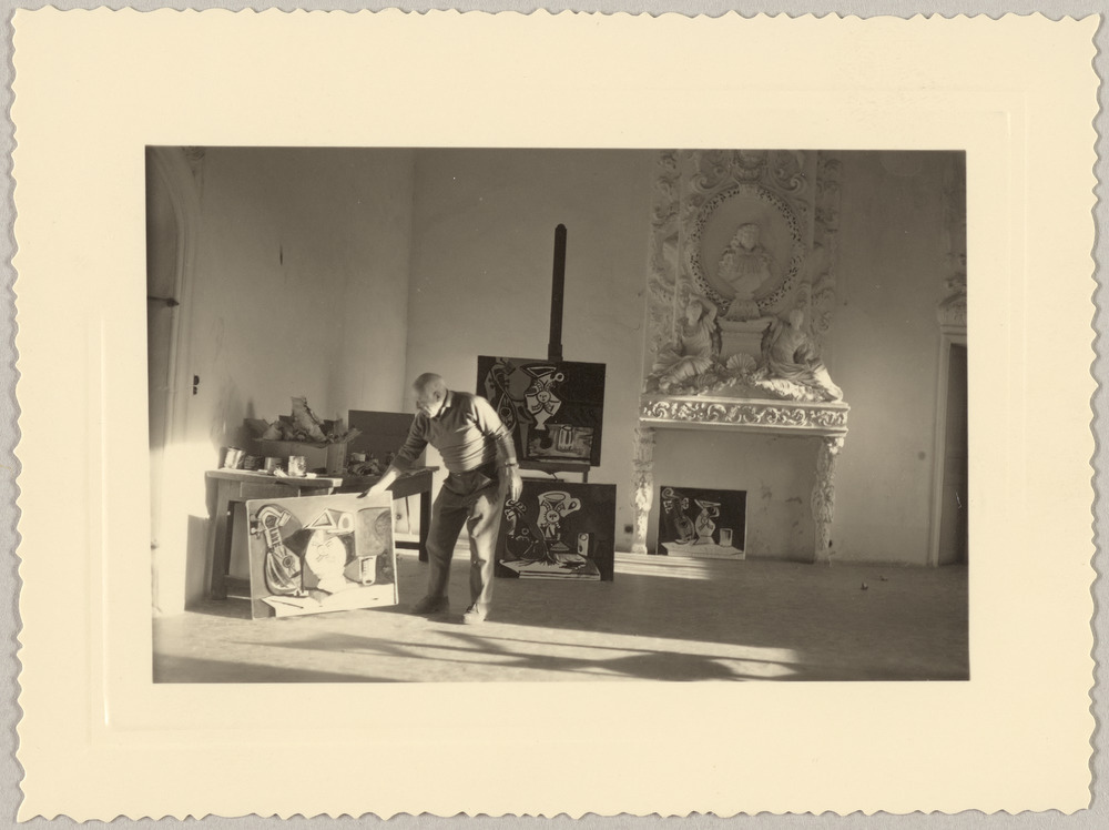 Présentes sur la photographie les œuvres "Nature morte" (tenue par Picasso ; Zervos, XVIII, 439), "Nature morte" (sous le chevalet ; Zervos, XVIII, 436) et "Nature morte" (contre le pied gauche de la cheminée ; Zervos, XVIII, 437).