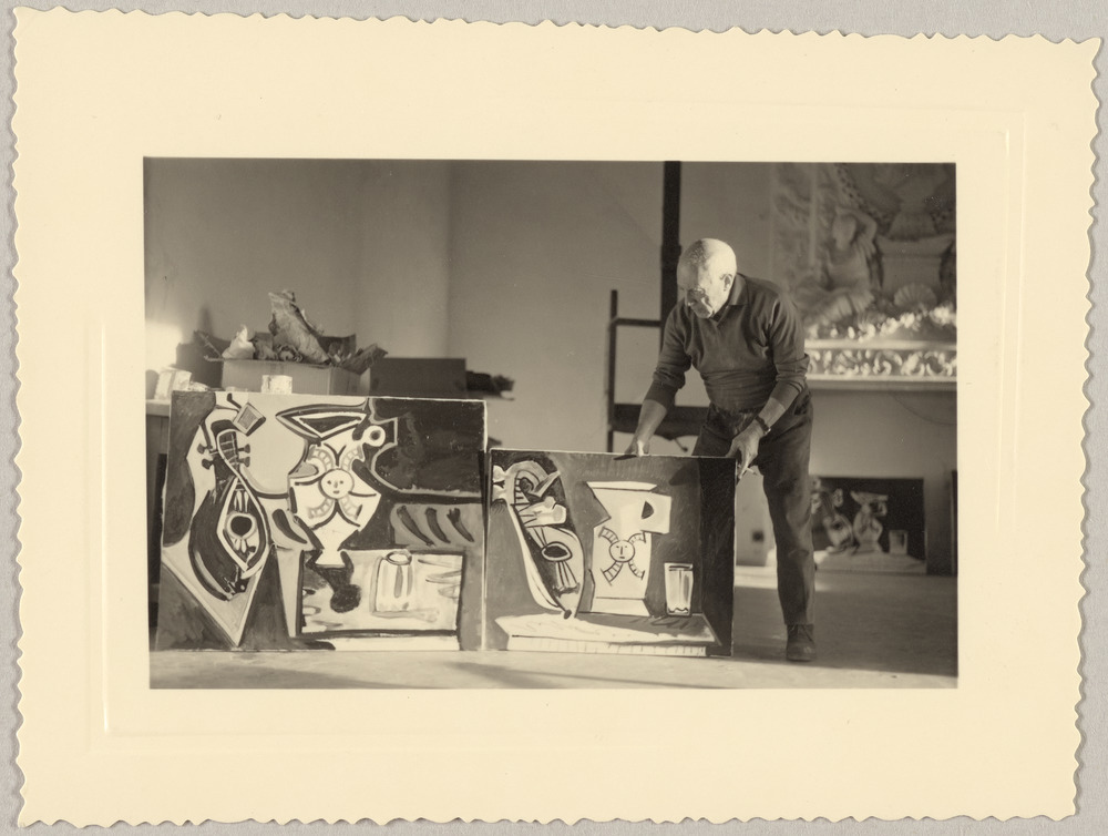 Présentes sur la photographie les œuvres "Nature morte" (tenue par Picasso ; Zervos, XVIII, 438) et "Nature morte" (au fond à droite ; Zervos, XVIII, 437).