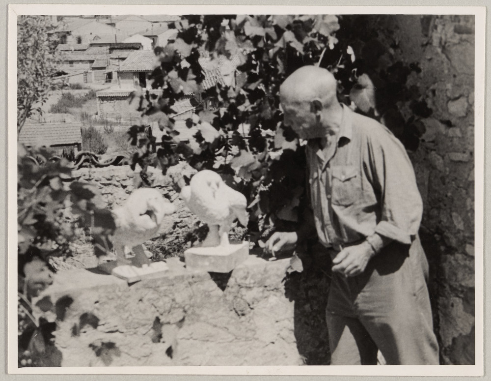 Pablo Picasso installant les sculptures en plâtre "La chouette" et "La chouette…