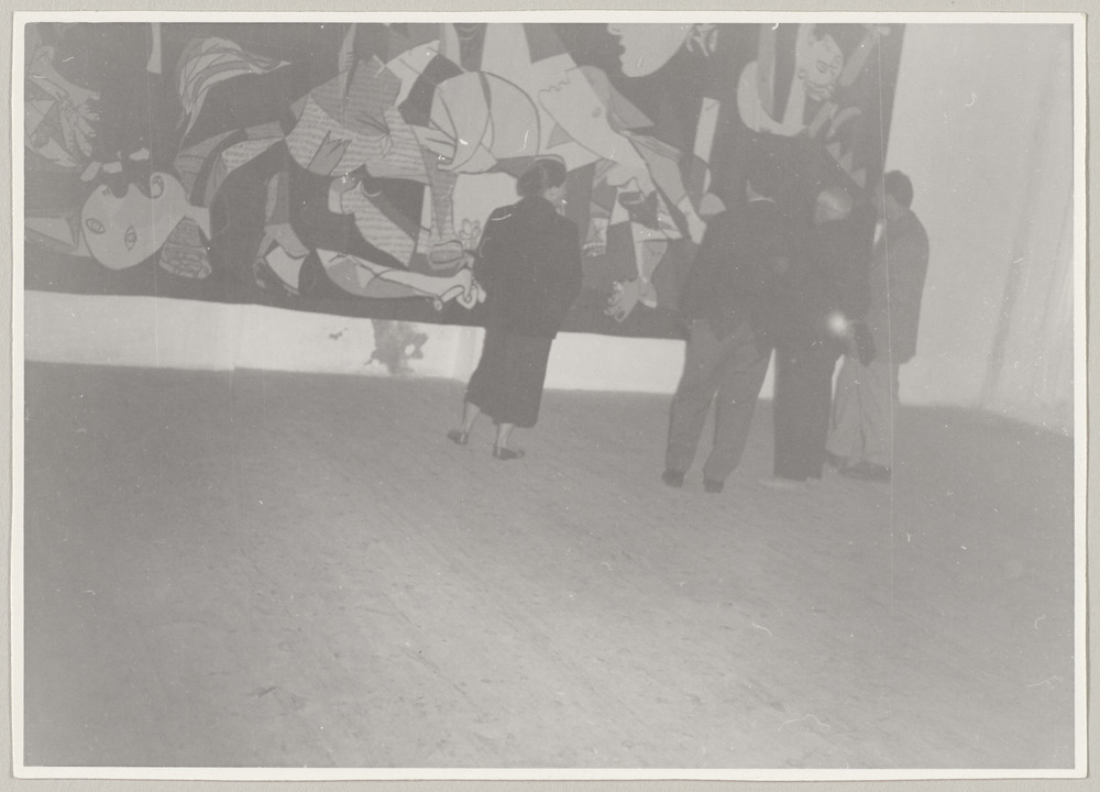 Pablo Picasso, Jacqueline de La Baume-Dürrbach et des amis devant la tapisserie de l'atelier de La Baume-Dürrbach représentant "Guernica" de Pablo Picasso et présentée au Musée Grimaldi, Antibes, en novembre 1955