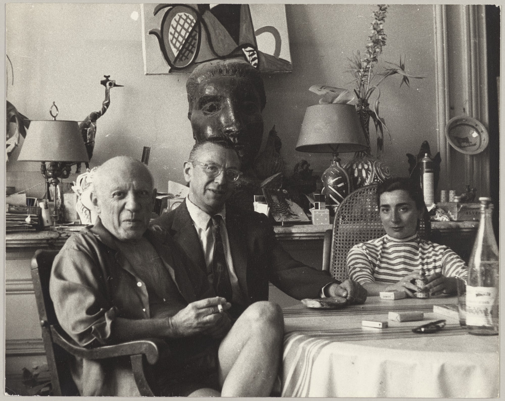 Pablo Picasso, Jacqueline Roque et un homme à La Californie, Cannes, en 1957