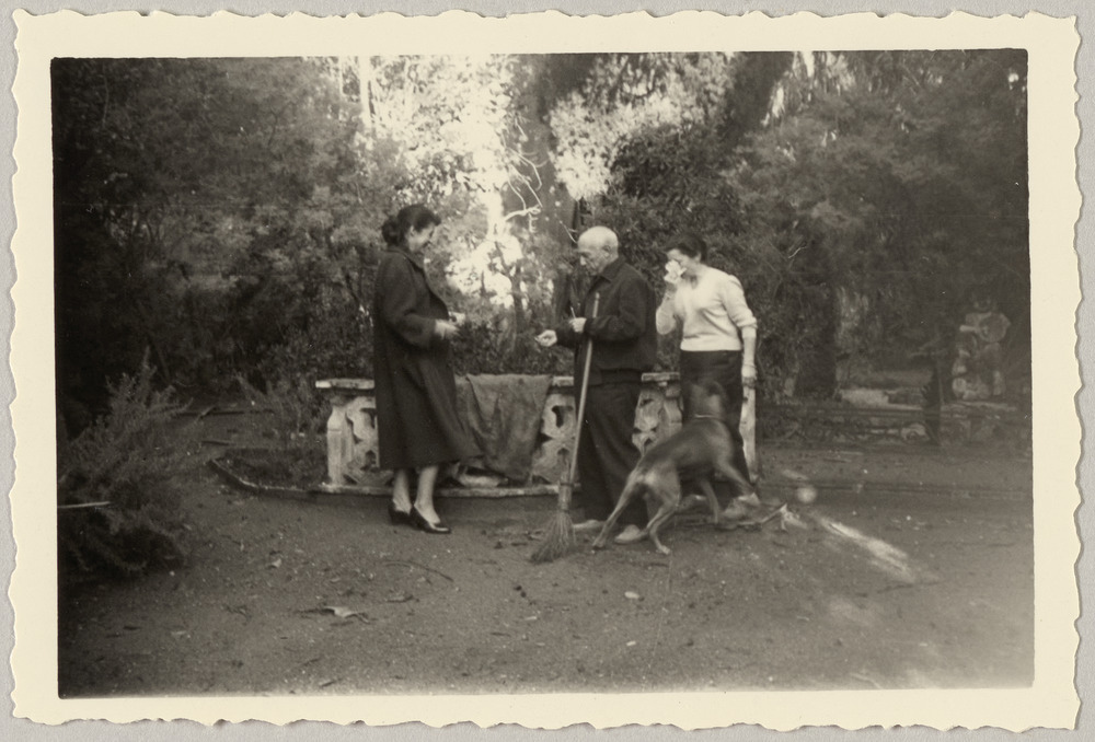 Pablo Picasso, Jacqueline Roque, Paule de Lazerme et Yan le boxer dans le jardin de la Californie, Cannes, en novembre 1955