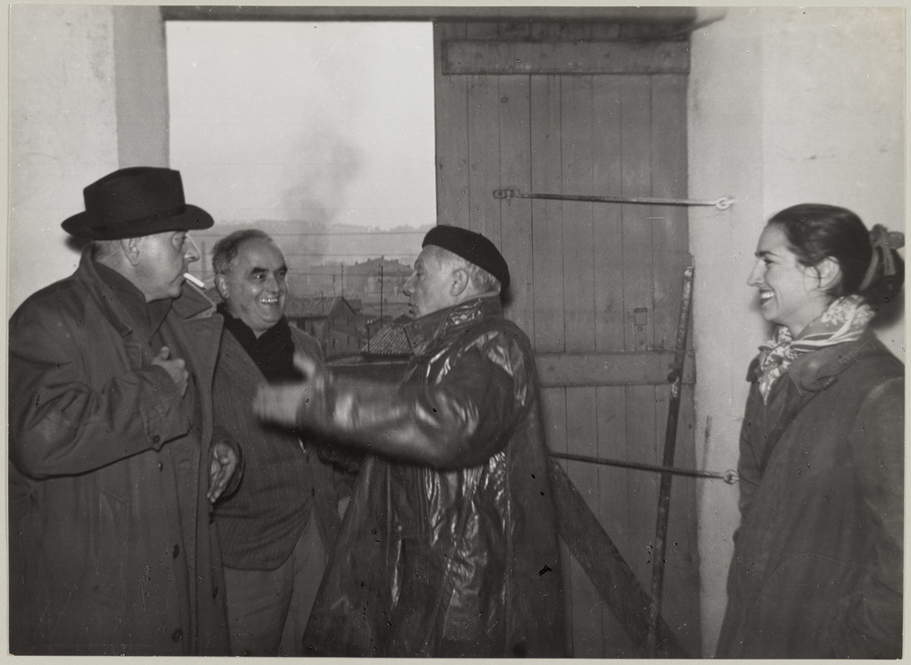 Pablo Picasso, Jacques Prévert, Françoise Gilot et le tisserand Ernest Jacques à la porte de l'atelier du Fournas, Vallauris, en [1949-50]
