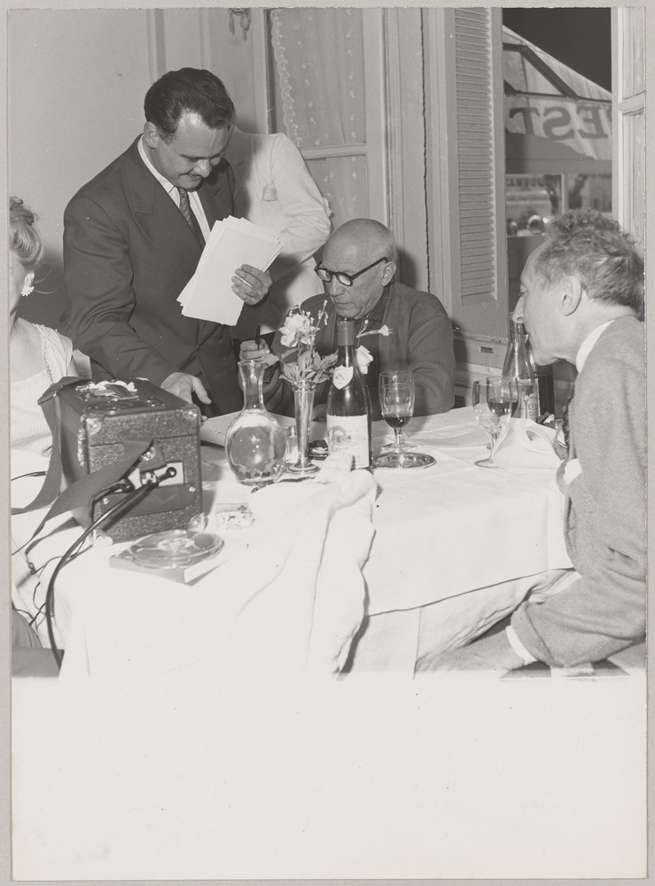 Pablo Picasso, Jean Cocteau et Henri Matarasso au restaurant, à Nîmes, en 1955