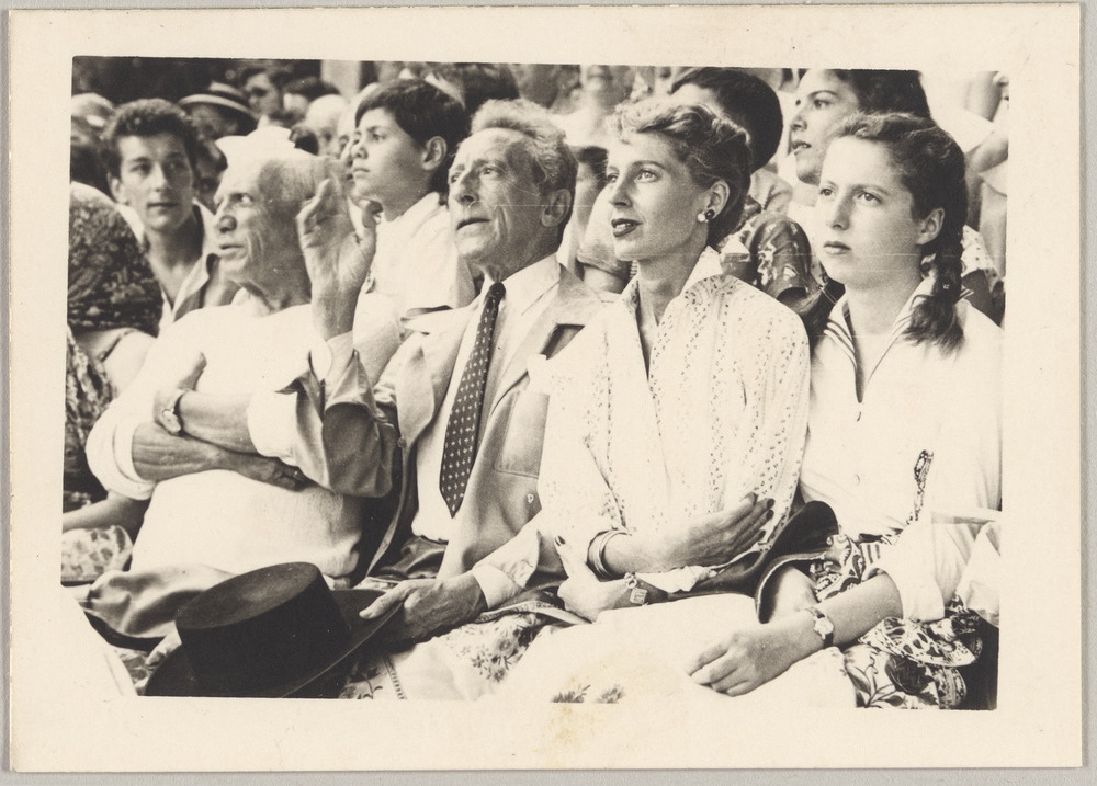 Pablo Picasso, Jean Cocteau, Francine Weisweiller et sa fille Carole à la corrida de Vallauris, en août 1955