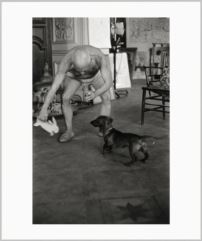 Pablo Picasso jouant avec Lump le teckel, à La Californie, Cannes, en 1957