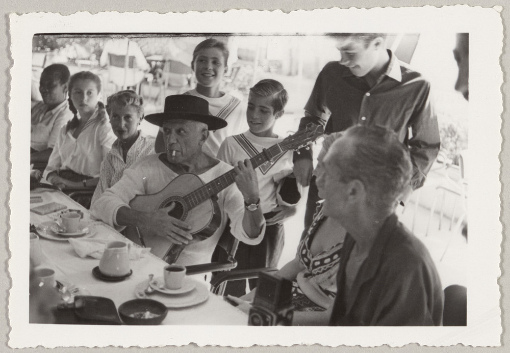 Pablo Picasso à la guitare avec Emilio Leopoldo Herrera Soler et son frère, Jacques-Henri Lartigue, Jeanne Creff, Francine Weisweiller et sa fille Carole, au restaurant, Vallauris, en août 1955