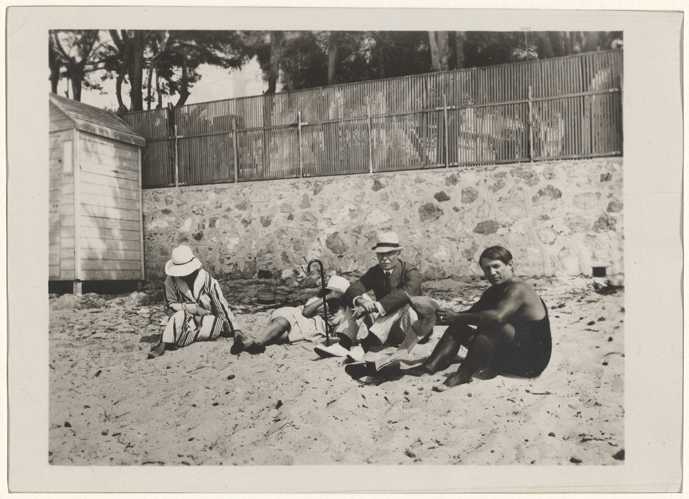 Pablo Picasso à la plage avec trois amis, à [Dinard, en 1922 ou Antibes, en…