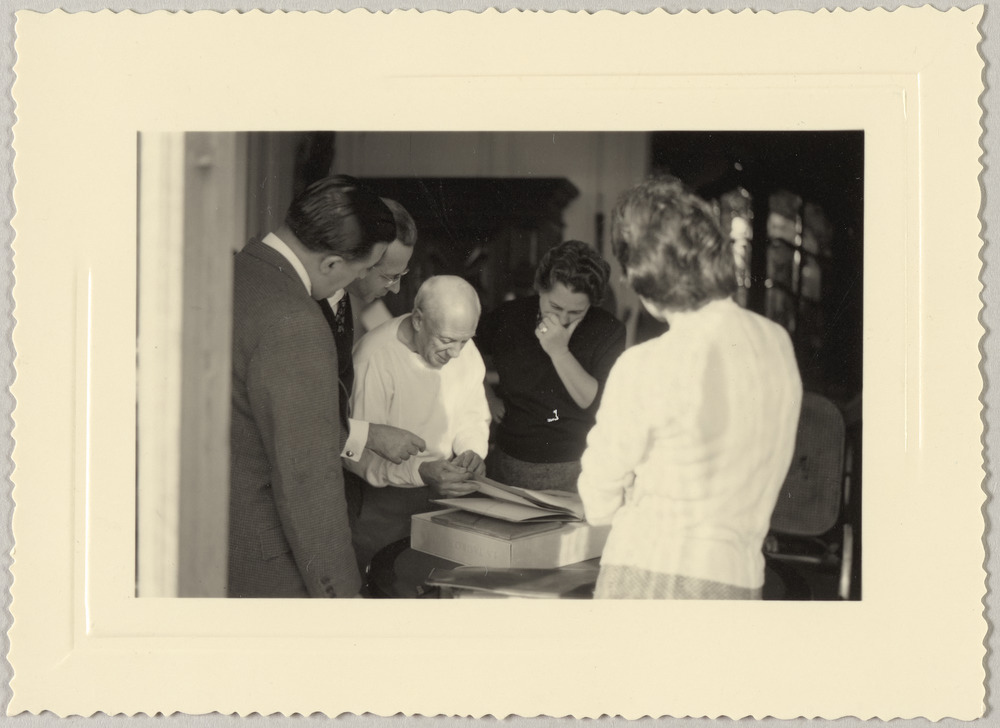 Pablo Picasso montrant un livre à Gustavo Gili Esteve, Anna Maria Torra de Gili…