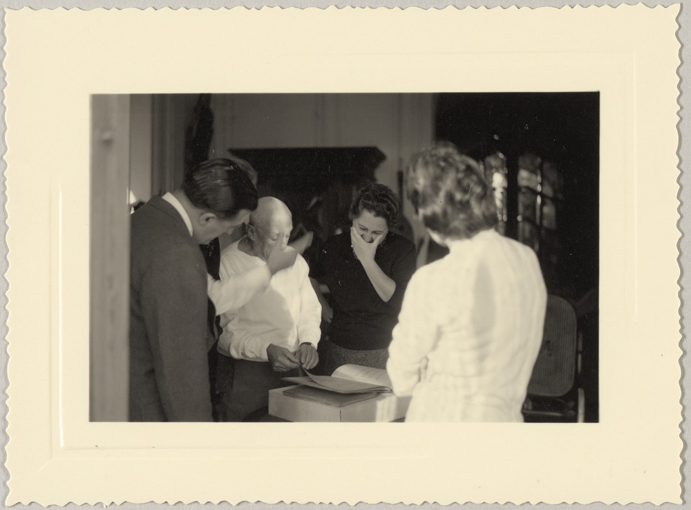 Pablo Picasso montrant un livre à Gustavo Gili Esteve, Anna Maria Torra de Gili…