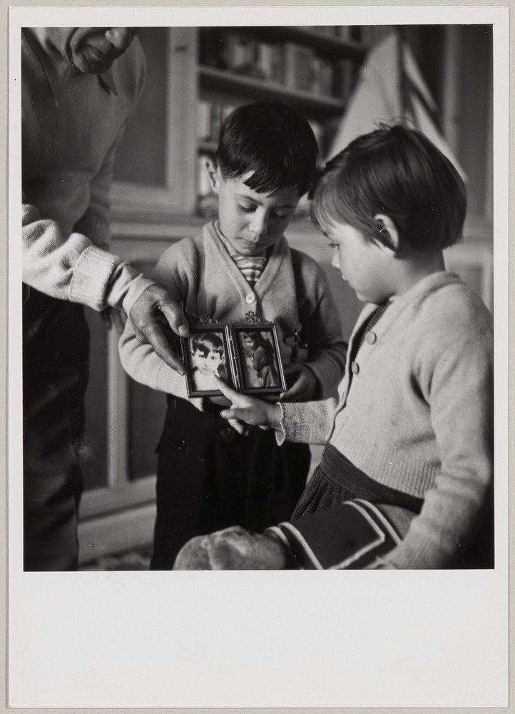 Pablo Picasso montrant une photographie de lui enfant à Claude et Paloma, à La Galloise, Vallauris, en 1953