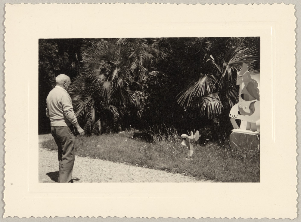 Pablo Picasso observant les sculptures en tôle "Footballeur" et "Femme au chapeau" dans le jardin de La Californie, Cannes, vers [1961]