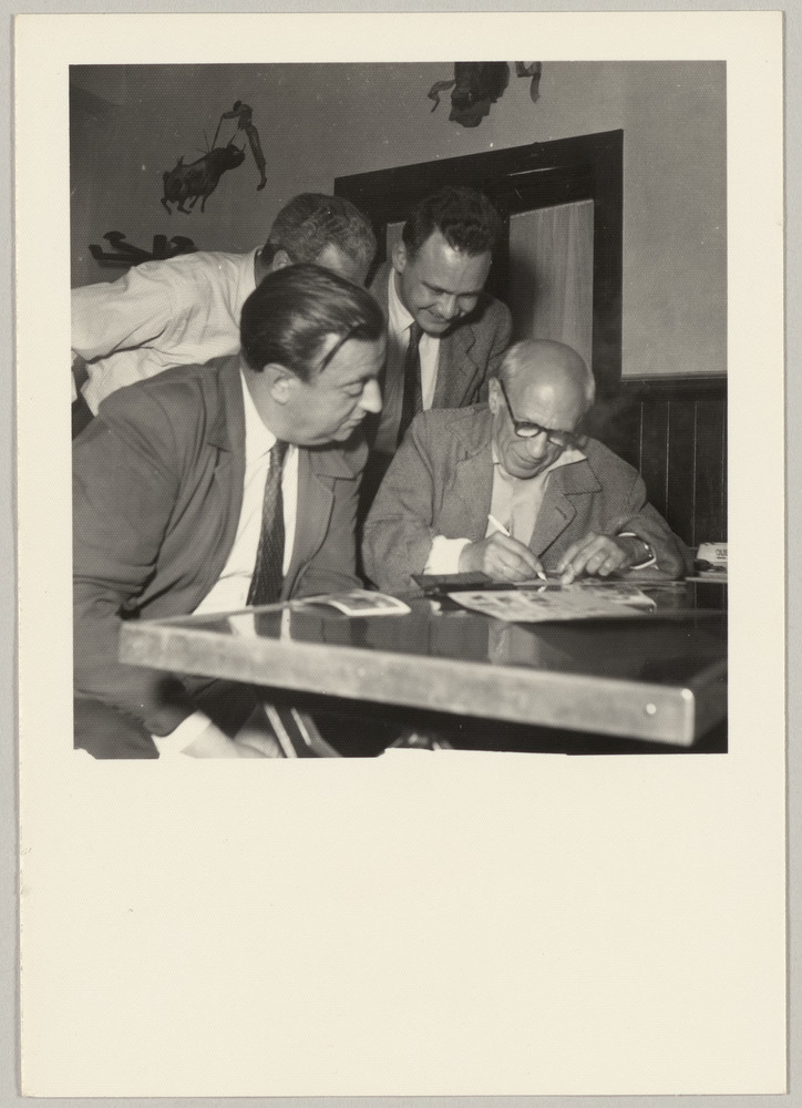 Pablo Picasso, Paco Munoz, Pierre Bertrand et un ami dans un café de [Vallauris], en 1955