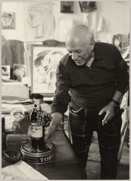 Pablo Picasso plaçant une bouteille de Xeres "habillée" en torero sur une boîte de biscuits Tortas Imperiales, à La Californie, Cannes, en [février 1959]