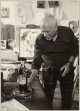 Pablo Picasso plaçant une bouteille de Xeres "habillée" en torero sur une boîte…