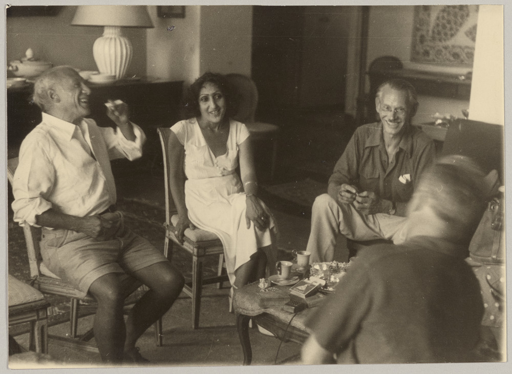 Pablo Picasso riant avec René Batigne et une amie dans le salon des Batigne, Vallauris, circa 1950